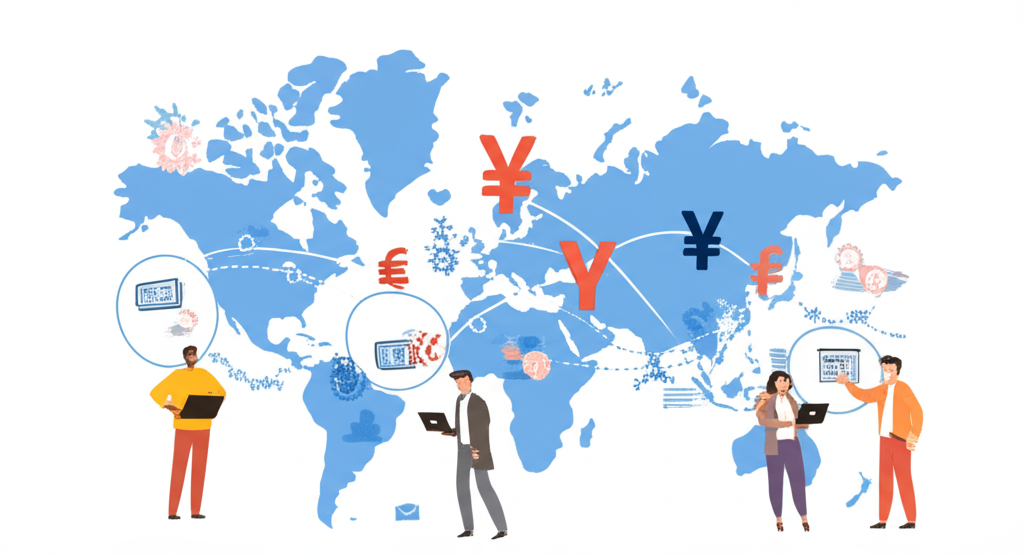ภาพประกอบเครือข่ายการเงินระดับโลกที่แสดงสัญลักษณ์สกุลเงินไหลเวียนระหว่างประเทศและผู้คนตัดสินใจทางการเงินอย่างชาญฉลาด