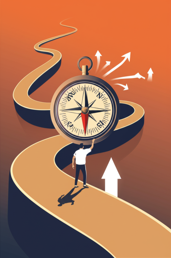 ภาพประกอบบุคคลนำทางเส้นทางซับซ้อนด้วยเข็มทิศแสดงแนวโน้มอนาคตและการตัดสินใจ
