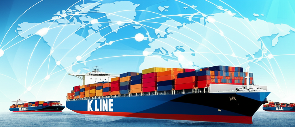 ภาพประกอบเครือข่ายการขนส่งทางเรือระดับโลกที่มีเรือสินค้า ตู้คอนเทนเนอร์ และโลโก้ K Line ที่ชัดเจน แสดงถึงการค้าขายระหว่างประเทศ